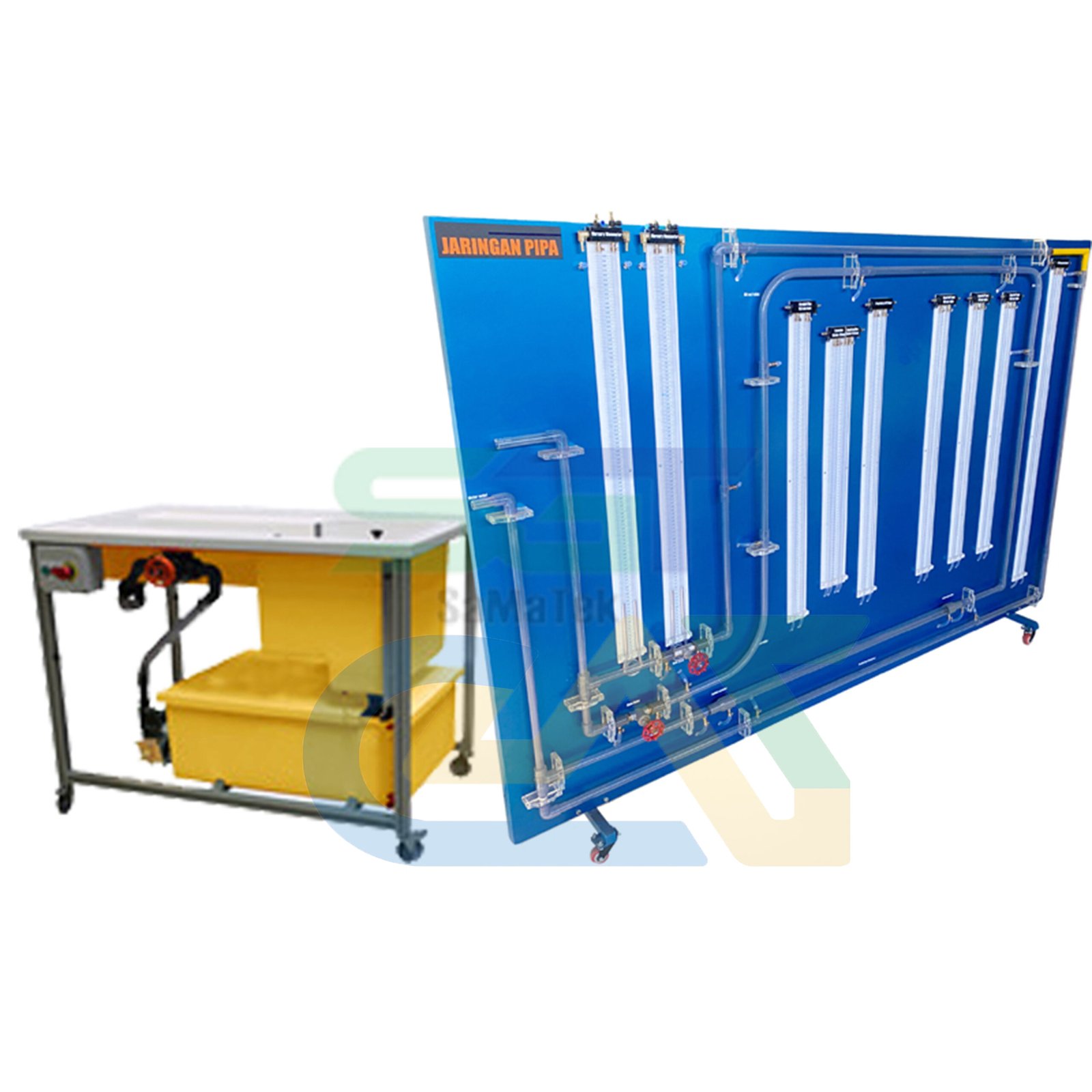 • Sirkuit Pipa Multi-Konfigurasi: Terdiri dari beberapa jalur pipa (seri dan paralel) yang dilengkapi dengan katup-katup isolasi untuk mengubah rute aliran air sesuai skenario pengujian.